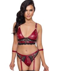 Kunstleder-BH, der an den Brüsten vollständig geöffnet werden kann und mit Ringen und Spitze verziert ist. Er passt sich jeder Brust an.