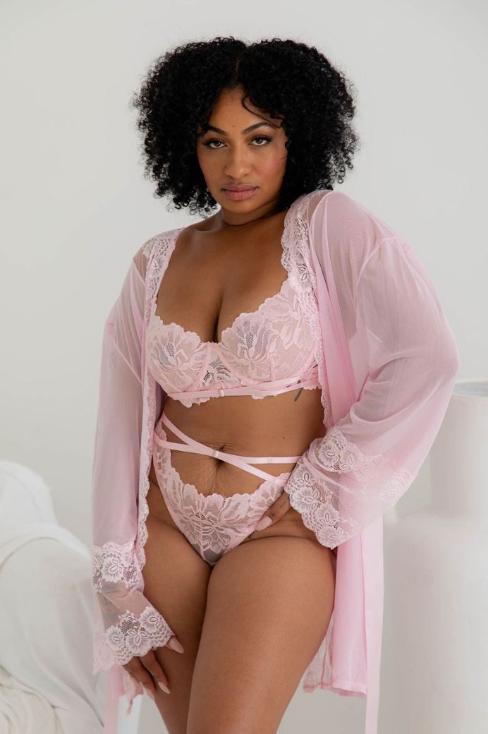 Das Bralette mit weichen Cups, Halfterkragen und Schnürdetails umschmeichelt Ihr Dekolleté, während der gerüschte Minirock mit Schürze die Karte der Unschuld ausspielt - na ja, fast.
