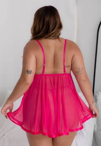 Ρομαντικό πεταλοειδές ροζ oversized babydoll με κέντημα πεταλούδας, σαγηνευτικό σκίσιμο και ασορτί στρινγκ. εγγυημένη κομψότητα και απαλότητα!