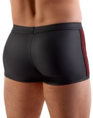 Tight-fitting boxer shorts in a matte black look with red woven latex side bands.