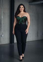 Este corpete overbust de cetim verde esmeralda com renda preta é feito à mão para valorizar a silhueta. O zíper lateral discreto une elegância e praticidade.