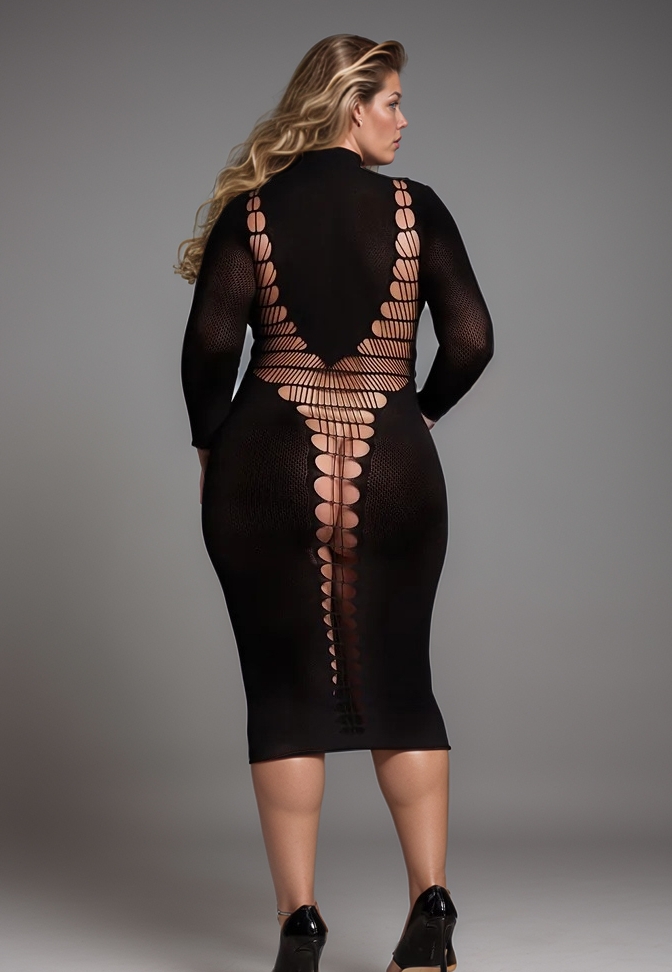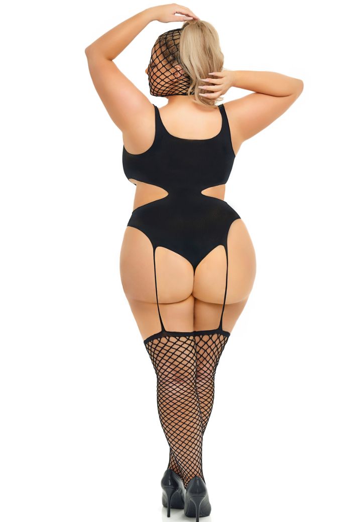 Plus size bodystocking jumpsuit with openwork on the legs and bare back.