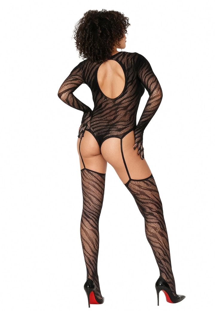 This zebra fishnet bodystocking features long sleeves with fingered gloves, keyhole open back, thong back, attached garters and matching thigh high stockings. Wild, sculpting and stretchy.