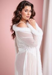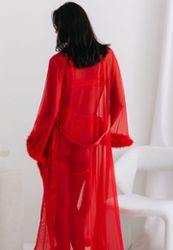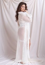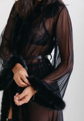 Este kimono largo y transparente es el epítome de la elegancia francesa, con su delicado ribete de piel que añade un irresistible toque de lujo. El tul vaporoso abraza con naturalidad las curvas generosas y crea un seductor velo de misterio.