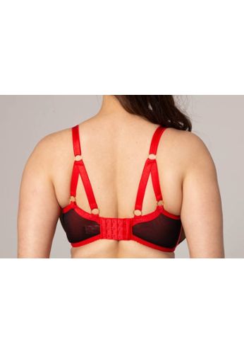 Un soutien à balconnets, sexy et très original avec un maintien impeccable. Ici décliné dans sa version noire et rouge. Prenez bien votre tour de sous poitrine, car nous n'égangerons pas ce modèle unique!