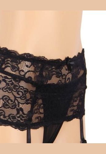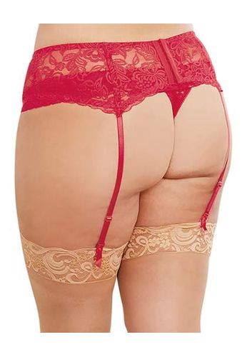 Un porte-jarretelles grande taille facile à enfiler, tout à fait adapté aux hanches larges. String assorti inclus.