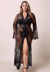 Kimono lungo taglia grande cintura trasparente in pizzo nero satinato