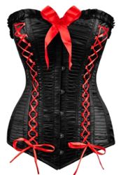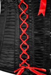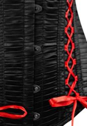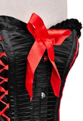 Dit cabaretkorset van zwart satijn, afgewerkt met opvallende rode linten en een grote strik, trekt gegarandeerd alle aandacht. De flatterende snit accentueert je vormen, terwijl de kruissnoering zorgt voor een nauwkeurige pasvorm.
