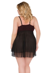 Deze chemise van twee materialen combineert de delicatesse van zachte zwarte voile met het comfort van een lijfje van donkerrode stretchstof.