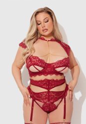 O cinto suspensório com recortes e correntes douradas na cintura dá um toque de glamour. A tanga de renda completa este conjunto de 3 peças absolutamente irresistível.