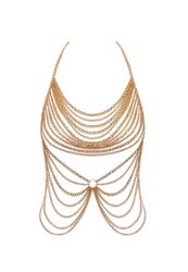 Uma corrente corporal dourada que veste a pele como uma joia: decoração de correntes luxuosa sobre o peito e a barriga, com 2 fechos (pescoço e cintura) para ajustar perfeitamente. Graças aos ajustes, adapta-se muito bem a todos os tamanhos. Use-a sozinha como lingerie ultra sexy ou por cima de banho e looks justos para um glamour irresistível.