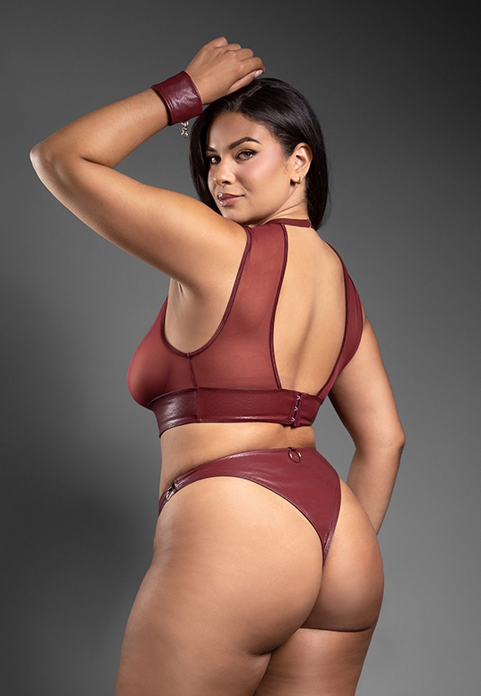 Conjunto de duas peças em pele sintética cor de vinho com algemas a condizer. Tamanhos 42-52. Top curto e cuecas altas com argolas de fixação para algemas incluídas.